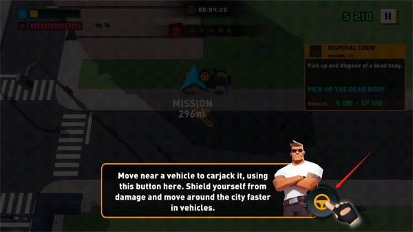 4、到達(dá)汽車邊在這里跟隨著指示進(jìn)行汽車駕駛操控的點(diǎn)擊,坐上汽車的駕駛座位,快速的飛馳在這個(gè)城市街道之上,撞飛所有人。