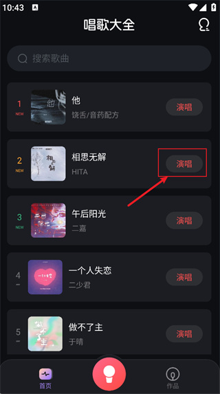 2、選擇一個(gè)要演唱的歌曲,或者通過(guò)搜索功能來(lái)找到;
