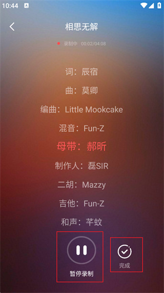 4、在演唱過(guò)程中可以隨時(shí)暫停,結(jié)束后點(diǎn)擊完成即可保存錄制的曲目。