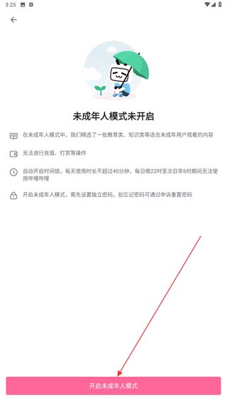 4、熟知未成年人的模式后,點擊開啟的按鈕即可。