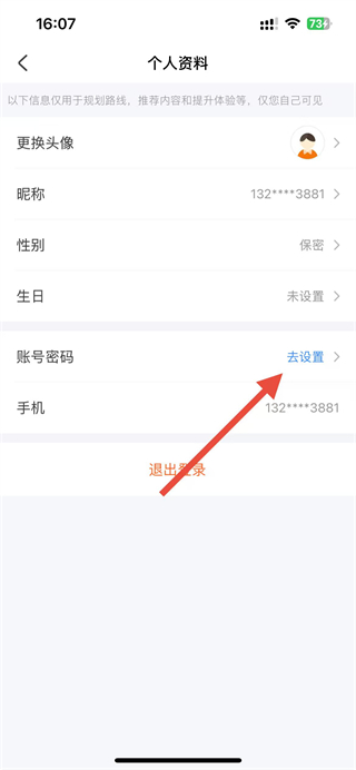 3、在個人資料頁面中,找到并點(diǎn)擊賬號密碼右側(cè)的去設(shè)置選項(xiàng)。