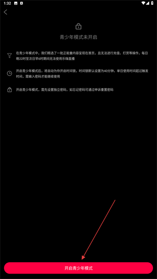 4、熟知青少年模式的規(guī)則后,點(diǎn)擊開啟的按鈕即可完成。