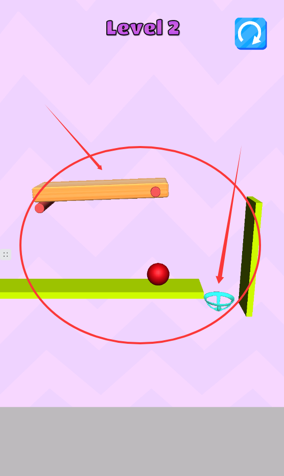 1、在畫面中你可見到磚塊、小球、籃筐等元素,使用劈開方法便可將小球移動(dòng)籃筐之中。