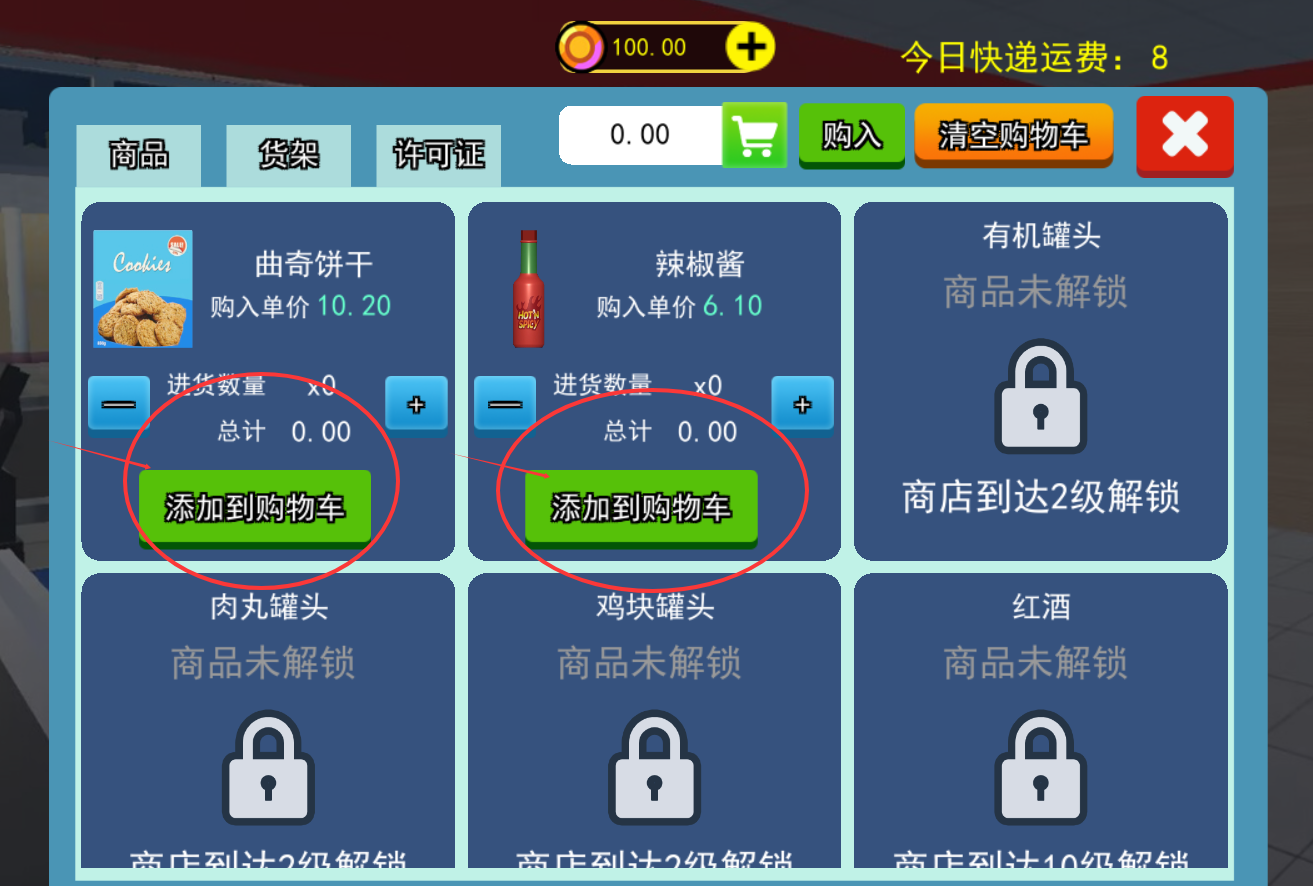 2、設(shè)定合理的進(jìn)貨商品及數(shù)量,類型包括了曲奇餅干、辣椒醬等。