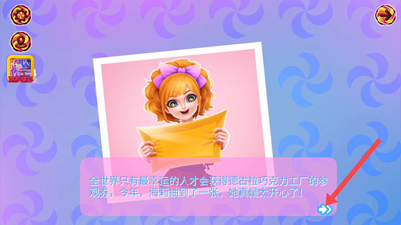 1、在初始劇情界面,點(diǎn)擊右下角箭頭按鈕,推進(jìn)劇情,進(jìn)入德古拉巧克力工廠參觀相關(guān)環(huán)節(jié)。