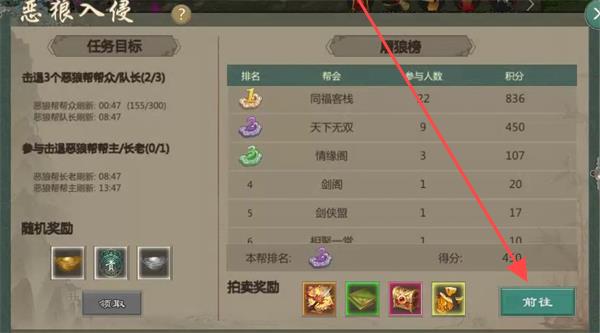 2、在活動界面,點擊“惡狼入侵”活動參與任務,按照任務目標(如擊潰惡狼幫眾/隊長)努力,參考惡狼榜排名、參與人數和積分情況,爭取隨機獎勵。