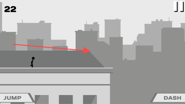 2、進(jìn)入游戲后,密切關(guān)注前方道路,當(dāng)遇到障礙時(shí),及時(shí)點(diǎn)擊屏幕左下角的【JUMP】按鈕,操控火柴人跳躍躲避。