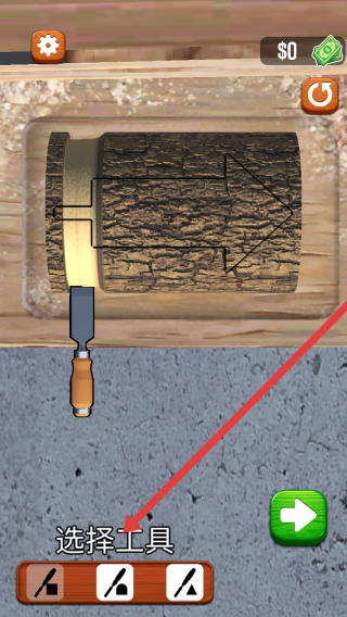 1、進入游戲界面,根據(jù)提示【選擇工具】,從下方工具圖標中選取合適工具開始雕刻木材。