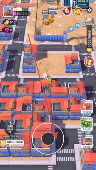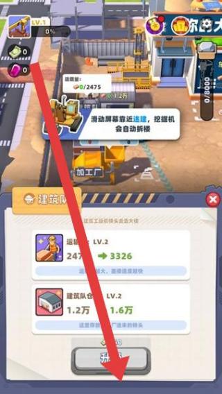 1、在城市地圖界面,跟隨紅色箭頭指向的建筑,點(diǎn)擊可進(jìn)行建造或升級(jí)操作,開啟城市建設(shè)進(jìn)程。