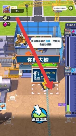 2、進(jìn)入建筑工地,滑動(dòng)屏幕靠近建筑,挖掘機(jī)會(huì)自動(dòng)拆除,按提示操作推進(jìn)工地建設(shè),完成拆除任務(wù)。