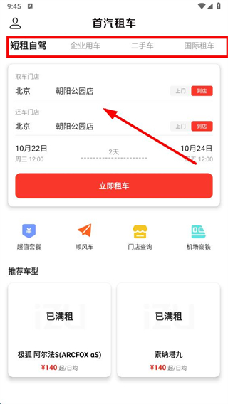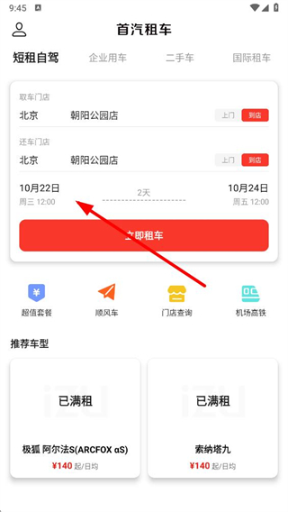1、打開首汽租車app,根據(jù)自身選擇板塊,設(shè)置取車門店和還車門店。