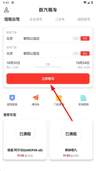 4、確認(rèn)取車還車門店、日期時(shí)間后,點(diǎn)擊立即租車按鈕,即可進(jìn)入后續(xù)租車流程。