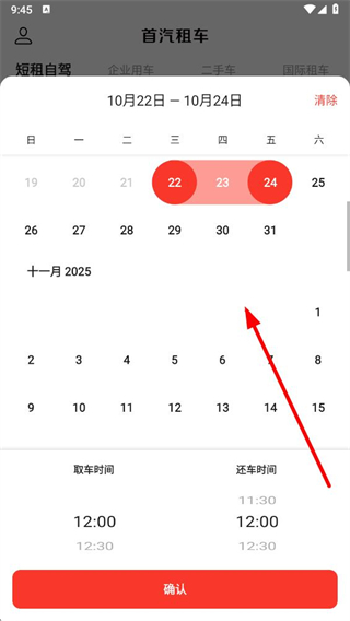 3、進(jìn)入日歷界面選擇取車和還車日期,并設(shè)置取還車時(shí)間。