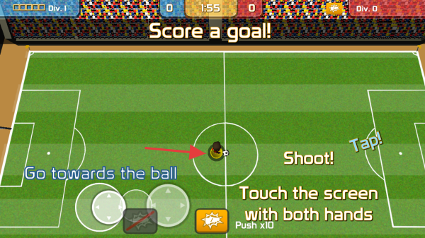3、比賽中,按照提示【Go-towards】靠近足球,通過屏幕下方按鈕操控角色,達成【Score】的目標。