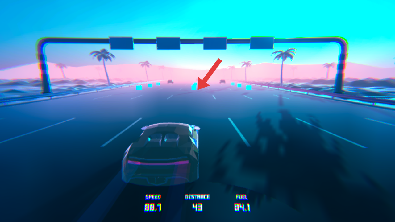 3、行駛過程中注意收集道路上的藍(lán)色方塊(如箭頭所指),獲取額外獎勵或助力,提升游戲體驗與成績。