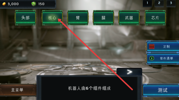 3、進入組件定制界面,選擇【核心】等組件(頭部、核心、臂、腿、武器、芯片),定制機器人,提升其性能。