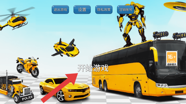 1、畫面中展示黃色可變形交通工具(警車、跑車、大巴、直升機(jī)等)與大黃蜂的機(jī)器人角色,玩家操控這些機(jī)械單位展開冒險(xiǎn),點(diǎn)擊【開始游戲】方可進(jìn)入。