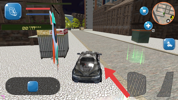 3、畫面中有一輛汽車行駛在城市街道上,界面包含駕駛控制按鈕、右上角地圖、左上角狀態(tài)條,玩家可操控車輛在城市環(huán)境中行駛,展現(xiàn)了駕駛操作與城市場(chǎng)景互動(dòng)體驗(yàn)。