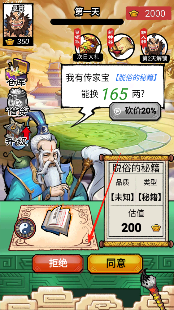 1、面對“脫俗的秘籍”交易,根據(jù)對方出價和砍價選項,思考后點擊“拒絕”或“同意”來決定交易走向。