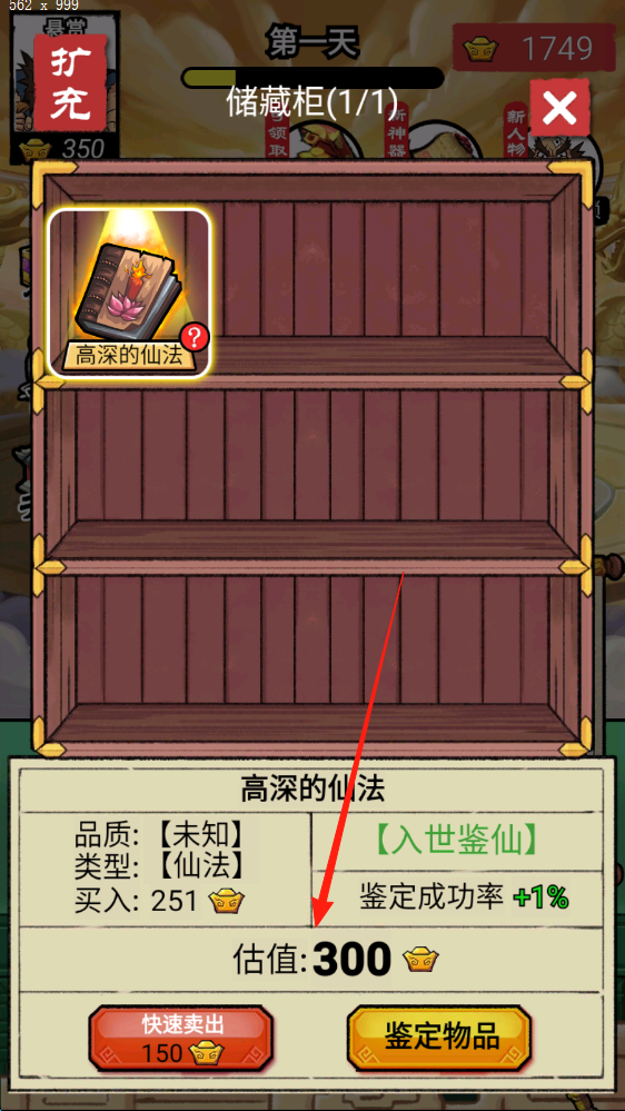 2、在儲藏柜界面,針對“高深的仙法”秘籍,可選擇“快速賣出”獲取金幣,或點擊“鑒定物品”嘗試提升其價值。