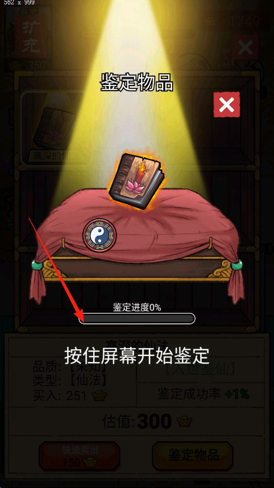 3、點擊“鑒定物品”后,按照“按住屏幕開始鑒定”提示,按住屏幕推進(jìn)鑒定進(jìn)度,探索秘籍真實價值。