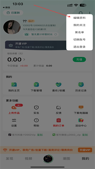 3、在右上角彈出的菜單欄中,選擇并點(diǎn)擊編輯資料的按鈕。