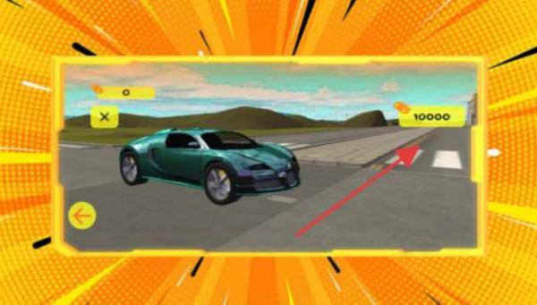 2、操控綠色跑車時,按箭頭指示點擊對應按鈕,可能用于加速或獲取獎勵(顯示“10000”)。