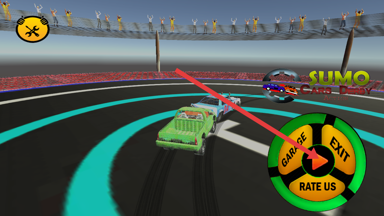 1、在游戲主界面,點(diǎn)擊右下角綠色圓形按鈕(箭頭指向),進(jìn)入游戲場景,開始賽車對(duì)戰(zhàn)。
