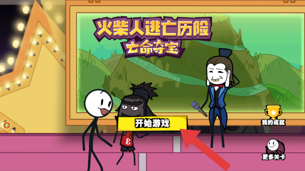 1、玩家將操控火柴人在亡命奪寶的情境下展開逃亡冒險,需應對各種阻礙、解開謎題來完成奪寶并成功逃亡,界面中【開始游戲】按鈕用于進入。