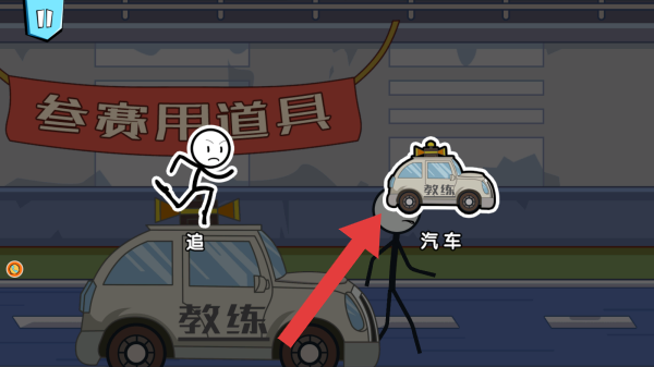 2、畫面中,火柴人處于道路場景,有參賽用道具橫幅,火柴人可選擇【汽車】道具,玩家需操控火柴人利用道具躲避追捕,增加逃亡過程的策略性與趣味性。