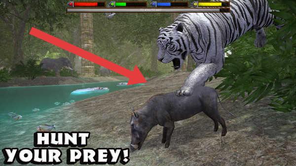 2、在狩獵環(huán)節(jié),按箭頭指向,操控角色(如老虎)對獵物(如野豬)進行追捕,通過屏幕上的操作按鈕完成攻擊動作。