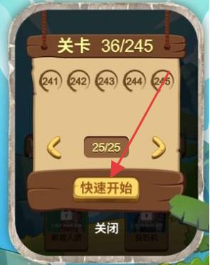 1、在關(guān)卡選擇界面,點(diǎn)擊“快速開始”進(jìn)入第36關(guān)(總245關(guān)),體驗(yàn)關(guān)卡挑戰(zhàn),關(guān)卡進(jìn)度顯示25/25。