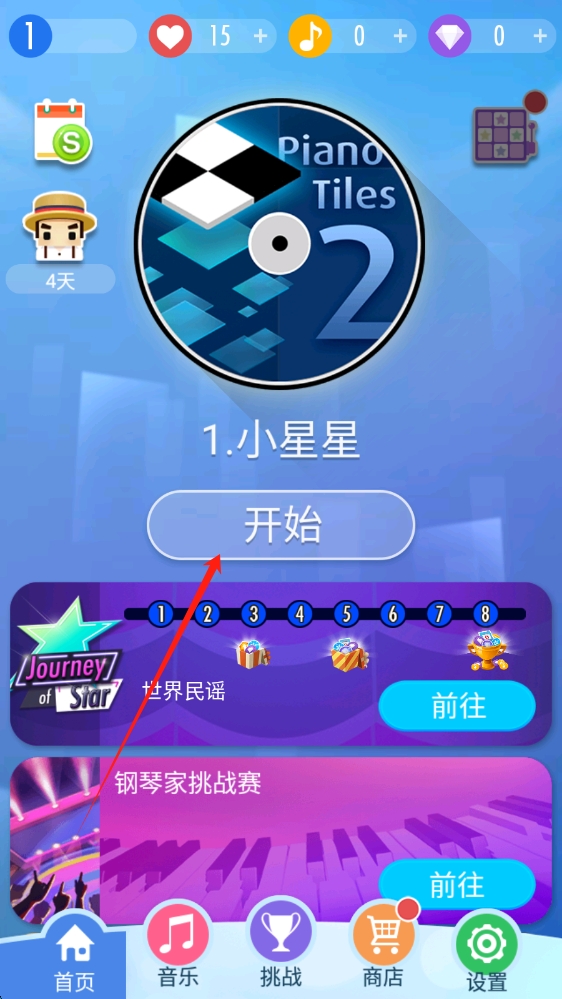 2、點擊選擇關(guān)卡,注意收集限定曲譜碎片,可能用于合成絕版歌曲,利用每日登錄獎勵獲取免費抽獎券與加速解鎖。