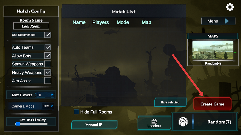 2、游戲主界面點(diǎn)Create Game創(chuàng)建房間,讓好友搜索房間點(diǎn)擊加入即可。