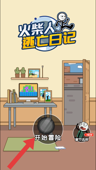 1、展示了游戲名稱(chēng)、開(kāi)始冒險(xiǎn)按鈕、章節(jié)選擇入口,以及房間場(chǎng)景(書(shū)桌、電腦、綠植、相框等元素),玩家可點(diǎn)擊【開(kāi)始冒險(xiǎn)】開(kāi)啟流程。