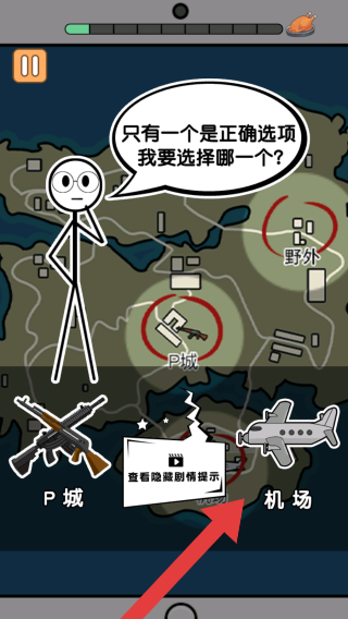 2、呈現(xiàn)火柴人在地圖場(chǎng)景(含野外、P城、機(jī)場(chǎng)等地點(diǎn)標(biāo)識(shí)),面臨選擇正確選項(xiàng)的解謎環(huán)節(jié),還有武器、飛機(jī)等元素及查看隱藏劇情提示功能。