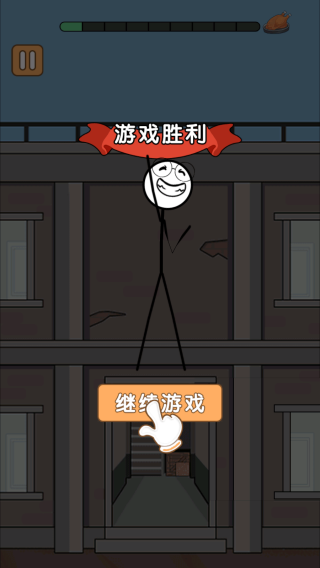 3、這是火柴人逃亡日記的游戲勝利界面,顯示火柴人角色,有橫幅、繼續(xù)游戲按鈕,代表當(dāng)前關(guān)卡已通關(guān),可點(diǎn)擊按鈕開(kāi)啟后續(xù)內(nèi)容。