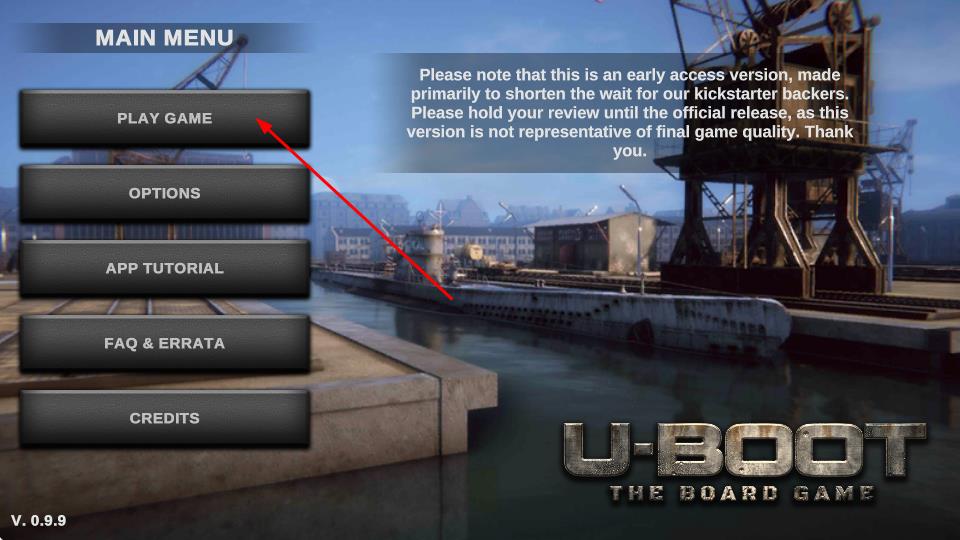 1、打開游戲進(jìn)入主界面后點(diǎn)擊【PLAY GAME】按鈕,在潛艇選擇界面點(diǎn)擊【U-99號(hào)】圖標(biāo)進(jìn)入戰(zhàn)前準(zhǔn)備場(chǎng)景。