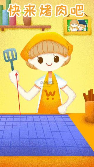 1、進(jìn)入游戲首先看見(jiàn)的就是游戲宣傳/啟動(dòng)界面,有卡通角色,文字快來(lái)烤肉吧。