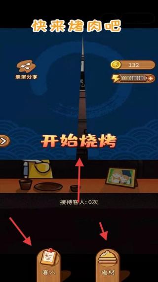 2、游戲主界面,顯示快來(lái)烤肉吧有開(kāi)始燒烤按鈕,可查看客人和食材,還有錄屏分享金幣132,電力1000000000等信息。
