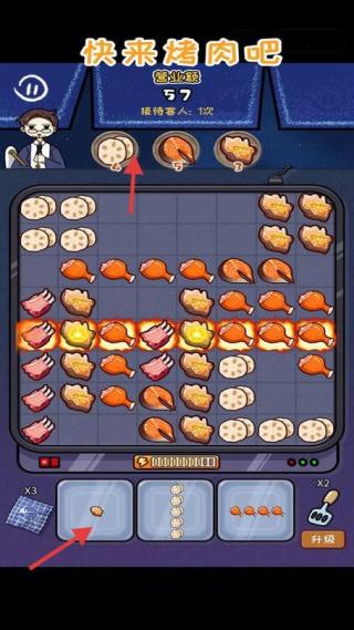 3、游戲烤肉操作界面,關(guān)卡第10級(jí),接待客人1次,有食材格子、操作按鈕,紅色箭頭指向食材和操作區(qū)。