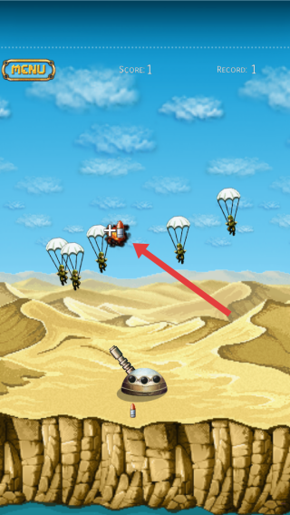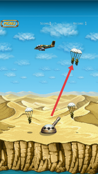 2、進入沙漠場景中,操控炮臺,瞄準(zhǔn)空中跳傘的敵人,點擊射擊,阻止小兵落地。