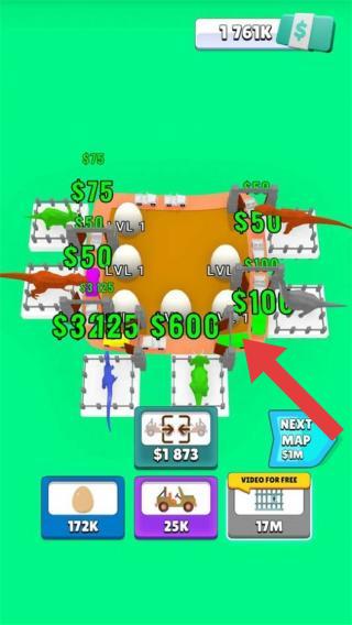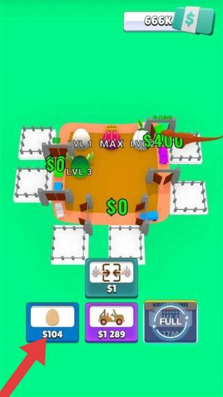 3、恐龍園區(qū)場景,顯示恐龍等級、收益、還有蛋、車輛等購買/升級按鈕,呈現(xiàn)恐龍公園經(jīng)營中培育、升級恐龍及設施,獲取收益的玩法。
