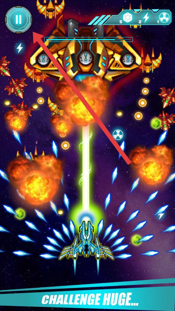 1、戰(zhàn)斗中,操控飛船,按箭頭指引點擊暫停,思考躲避敵方炮火,瞄準巨型boss攻擊。
