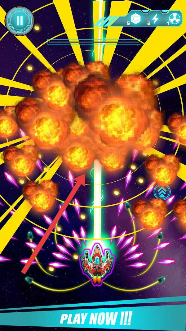 1、太空視覺盛宴:呈現(xiàn)迷人星際背景與敵機爆炸特效,光影閃爍的子彈與絢爛的能量波交織,帶來極具沖擊力的戰(zhàn)斗畫面。