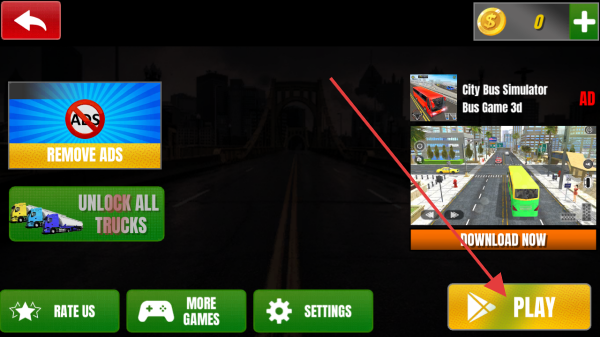 1、點擊【PLAY】,進入游戲主界面,可選擇移除廣告、解鎖卡車等,開啟模擬駕駛挑戰(zhàn),體驗不同卡車任務。