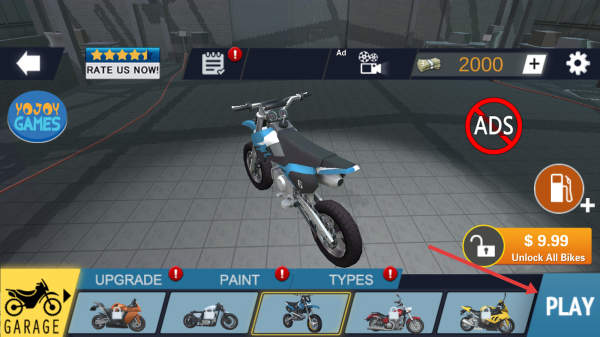 1、點擊【TapToRide】,進入摩托車駕駛游戲,選車庫中藍色摩托(點【PLAY】)。