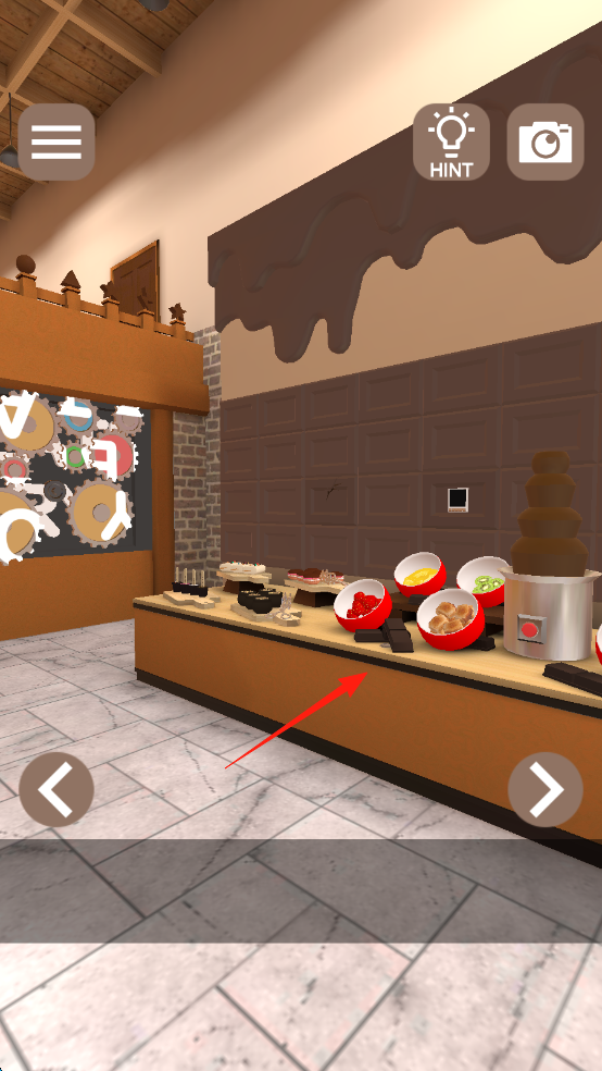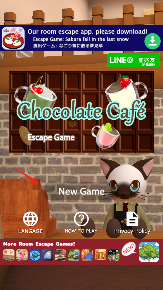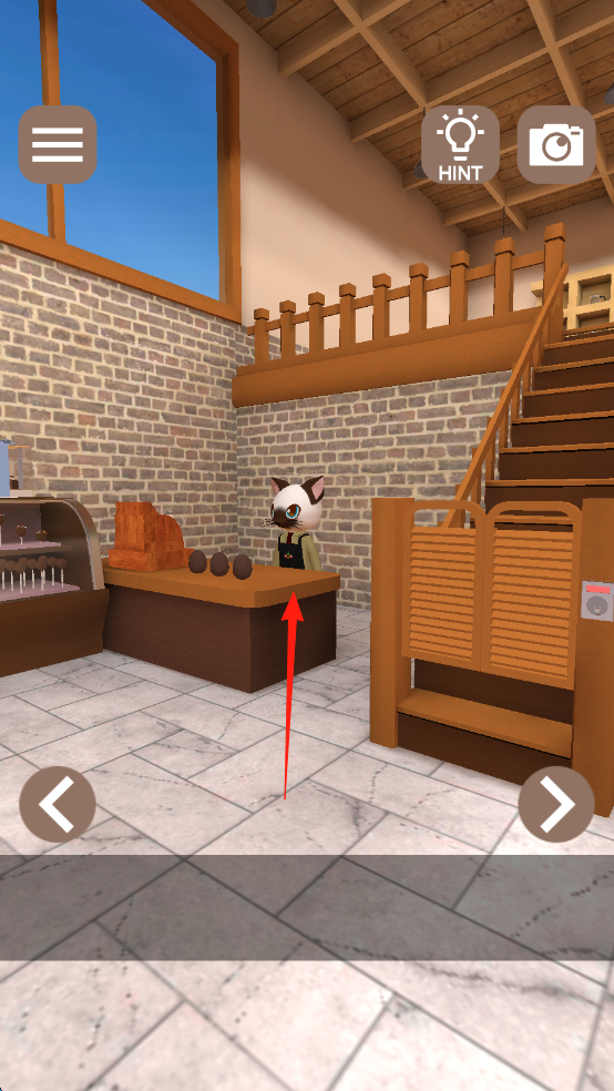 1、點擊【NewGame】,進入咖啡館,與貓咪互動(紅箭頭),查看柜臺線索(巧克力蛋)。