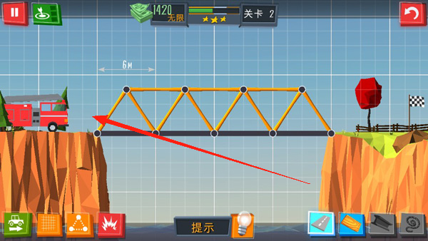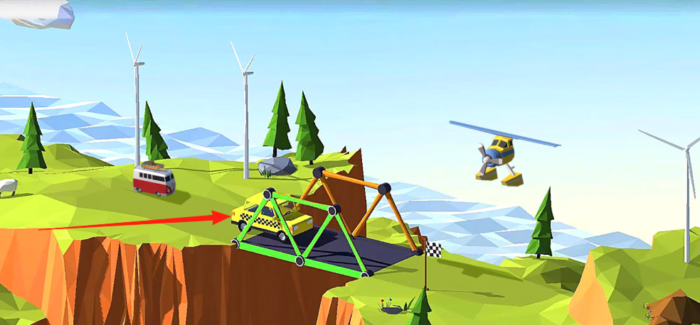 1、橋梁搭建機制:通過點擊屏幕選擇材料與連接點,精準構建承重結構,結合三角形原理與懸索設計,突破高難度地形。
