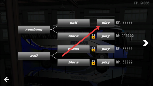 2、選擇已解鎖路線(如“pati”下的“play”),支付對(duì)應(yīng)RP(如100000),進(jìn)入該路線的駕駛?cè)蝿?wù)。